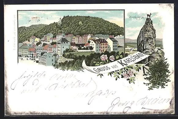 Lithographie Karlsbad, Hirschensprung, Ortsansicht mit Berg