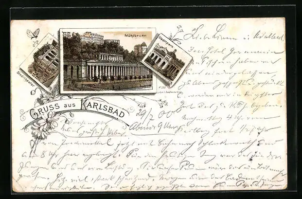 Lithographie Karlsbad, Mühlbrunn, Stadttheater, Stadtpark