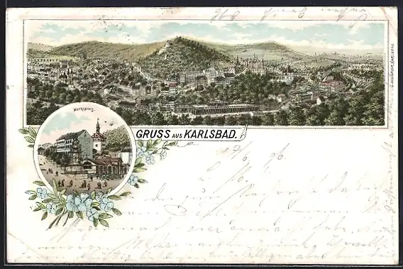 Lithographie Karlsbad, Ortsansicht und Marktplatz