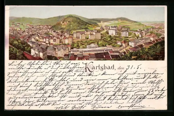 Lithographie Karlsbad, Panoramablick auf den Kurort