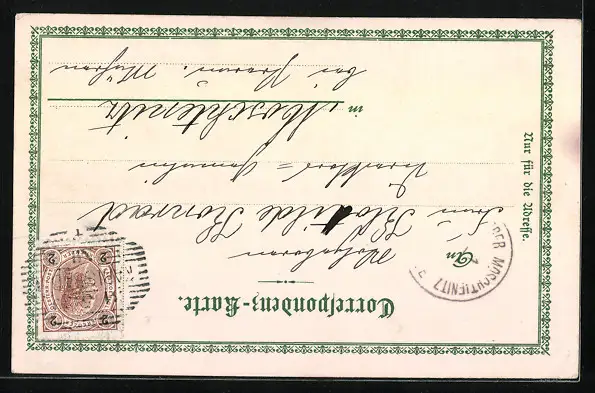 Personenbezogene Daten auf der Rückseite der Karte wurden durch blauen Textmarker unkenntlich gemacht. Die blauen Stellen sind auf die Vorderseite durchgeweicht und wirken sich negativ auf das Postkartenfoto aus