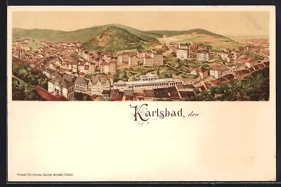 Lithographie Karlsbad, Panoramablick auf den Ort