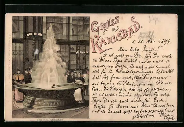 Lithographie Karlsbad, Sprudel-Springer, Kurgäste und Brunnenmädchen