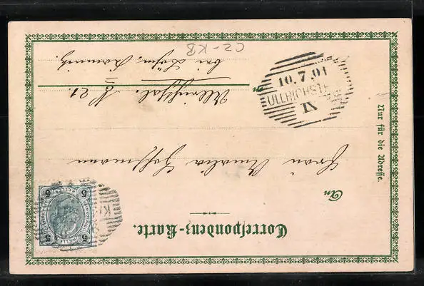 Personenbezogene Daten auf der Rückseite der Karte wurden durch blauen Textmarker unkenntlich gemacht. Die blauen Stellen sind auf die Vorderseite durchgeweicht und wirken sich negativ auf das Postkartenfoto aus