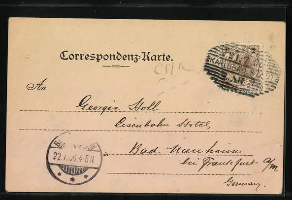 Personenbezogene Daten auf der Rückseite der Karte wurden durch blauen Textmarker unkenntlich gemacht. Die blauen Stellen sind auf die Vorderseite durchgeweicht und wirken sich negativ auf das Postkartenfoto aus