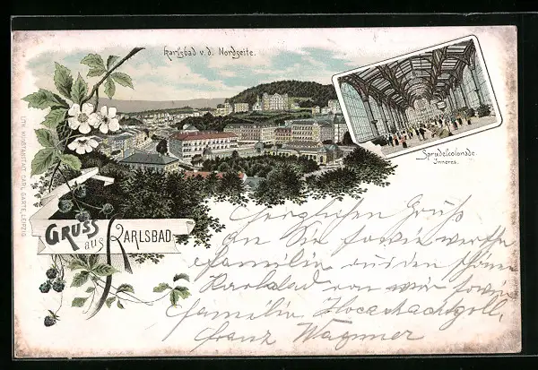 Lithographie Karlsbad, Teilansicht v. d. Nordseite, Sprudelcolonnade Inneres