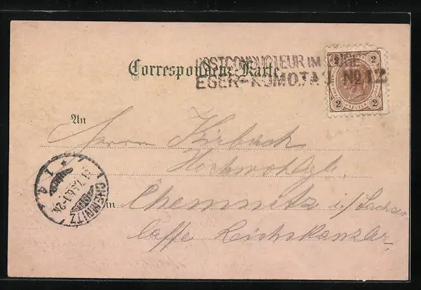 Personenbezogene Daten auf der Rückseite der Karte wurden durch blauen Textmarker unkenntlich gemacht. Die blauen Stellen sind auf die Vorderseite durchgeweicht und wirken sich negativ auf das Postkartenfoto aus