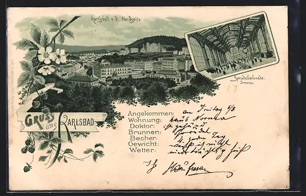 Lithographie Karlsbad, Teilansicht von der Nordseite, Sprudelcolonade, Inneres