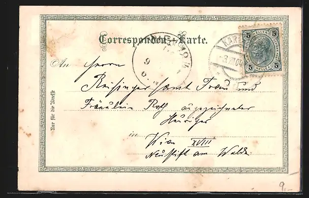 Personenbezogene Daten auf der Rückseite der Karte wurden durch blauen Textmarker unkenntlich gemacht. Die blauen Stellen sind auf die Vorderseite durchgeweicht und wirken sich negativ auf das Postkartenfoto aus