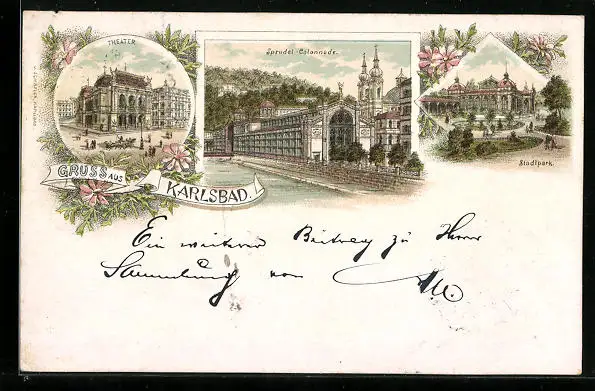 Lithographie Karlsbad, Theater, Sprudel-Colonnade, Stadtpark