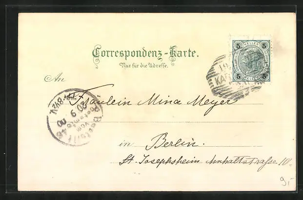 Personenbezogene Daten auf der Rückseite der Karte wurden durch blauen Textmarker unkenntlich gemacht. Die blauen Stellen sind auf die Vorderseite durchgeweicht und wirken sich negativ auf das Postkartenfoto aus