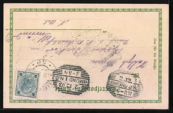 Personenbezogene Daten auf der Rückseite der Karte wurden durch blauen Textmarker unkenntlich gemacht. Die blauen Stellen sind auf die Vorderseite durchgeweicht und wirken sich negativ auf das Postkartenfoto aus