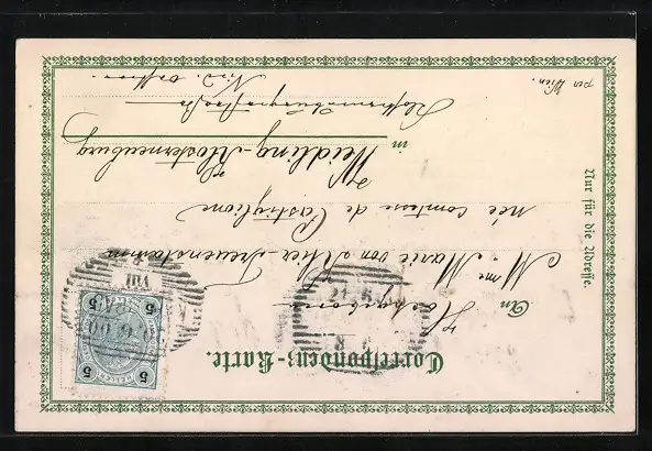 Personenbezogene Daten auf der Rückseite der Karte wurden durch blauen Textmarker unkenntlich gemacht. Die blauen Stellen sind auf die Vorderseite durchgeweicht und wirken sich negativ auf das Postkartenfoto aus