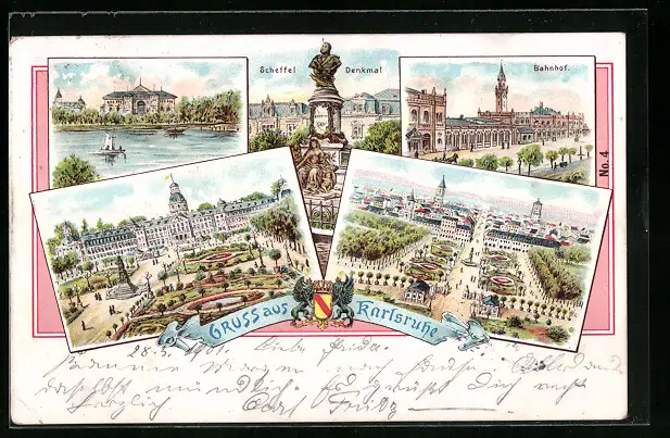 Lithographie Karlsruhe, Bahnhof, Scheffel-Denkmal, Schloss mit Garten