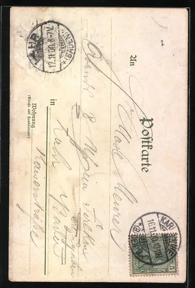Personenbezogene Daten auf der Rückseite der Karte wurden durch blauen Textmarker unkenntlich gemacht. Die blauen Stellen sind auf die Vorderseite durchgeweicht und wirken sich negativ auf das Postkartenfoto aus