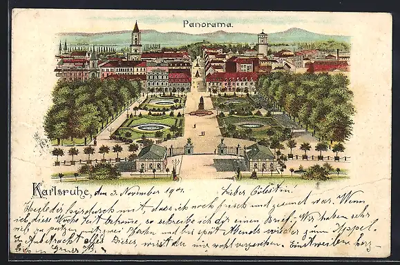 Lithographie Karlsruhe, Blick vom Schlossturm Richtung Süden