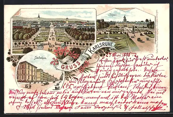 Lithographie Karlsruhe, Cadettenhaus, Parkanlage von oben, Schloss