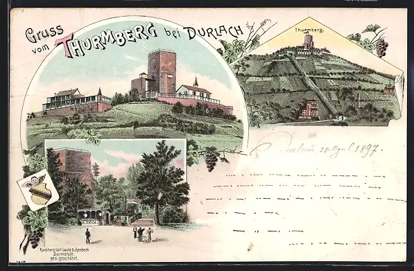Lithographie Karlsruhe-Durlach, Partie und Blick zum Thurmberg