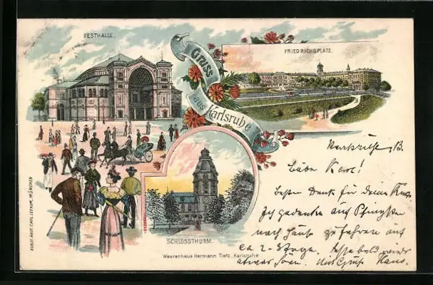 Lithographie Karlsruhe, Festhalle, Friedrichsplatz, Schlossturm