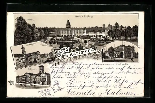 Lithographie Karlsruhe, Festhalle, Marktplatz und Rathhaus