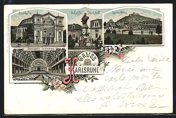 Lithographie Karlsruhe, Festhalle, Scheffel Denkmal, Lauterberg