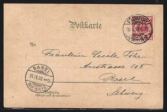 Personenbezogene Daten auf der Rückseite der Karte wurden durch blauen Textmarker unkenntlich gemacht. Die blauen Stellen sind auf die Vorderseite durchgeweicht und wirken sich negativ auf das Postkartenfoto aus