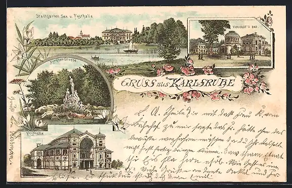 Lithographie Karlsruhe, Festhalle, Vierordts Bad, Nymphen-Gruppe