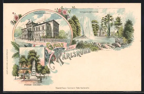 Lithographie Karlsruhe, Generalcommando, Schlossgartensee, Kriegerdenkmal