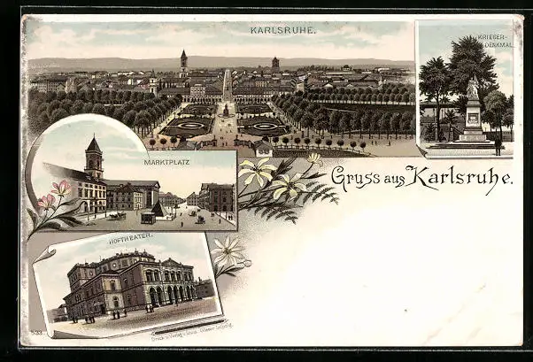 Lithographie Karlsruhe, Gesamtansicht aus der Vogelschau, Krieger-Denkmal, Marktplatz, Hoftheater