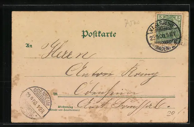 Personenbezogene Daten auf der Rückseite der Karte wurden durch blauen Textmarker unkenntlich gemacht. Die blauen Stellen sind auf die Vorderseite durchgeweicht und wirken sich negativ auf das Postkartenfoto aus