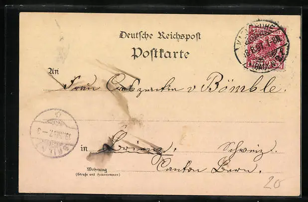 Personenbezogene Daten auf der Rückseite der Karte wurden durch blauen Textmarker unkenntlich gemacht. Die blauen Stellen sind auf die Vorderseite durchgeweicht und wirken sich negativ auf das Postkartenfoto aus