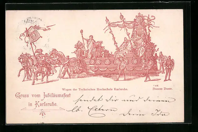 Lithographie Karlsruhe, Jubiläumsfest, Wagen der Technischen Hochschule, Docent Doerr