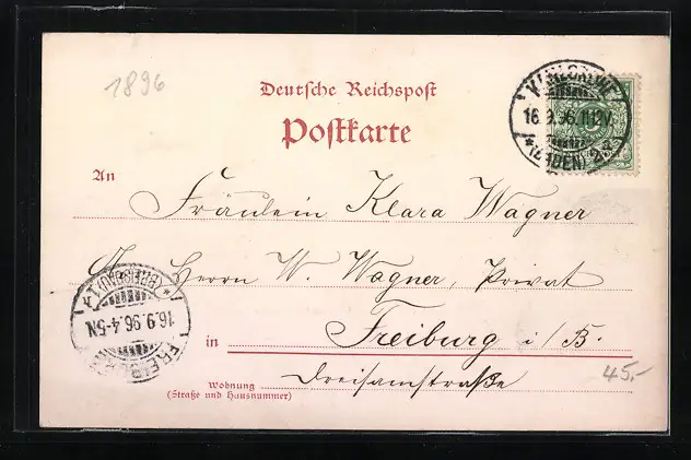 Personenbezogene Daten auf der Rückseite der Karte wurden durch blauen Textmarker unkenntlich gemacht. Die blauen Stellen sind auf die Vorderseite durchgeweicht und wirken sich negativ auf das Postkartenfoto aus