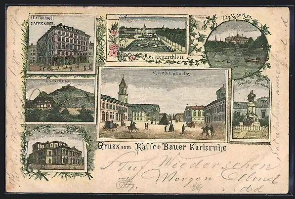 Lithographie Karlsruhe, Kaffee Bauer, Marktplatz, Scheffel Denkmal