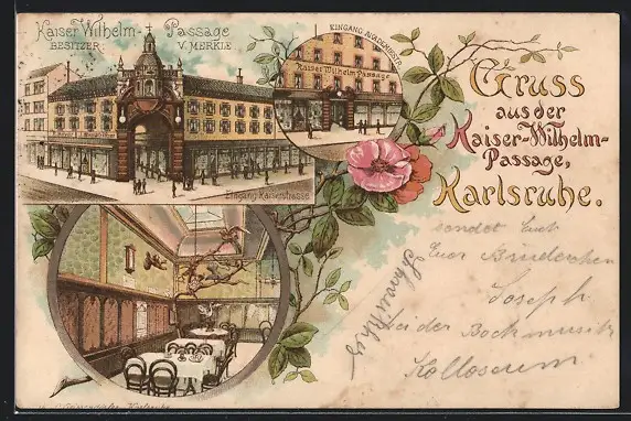 Lithographie Karlsruhe, Kaiser Wilhelm-Passage, Eingang Kaiserstrasse, Eingang Akademiestrasse, Restaurant