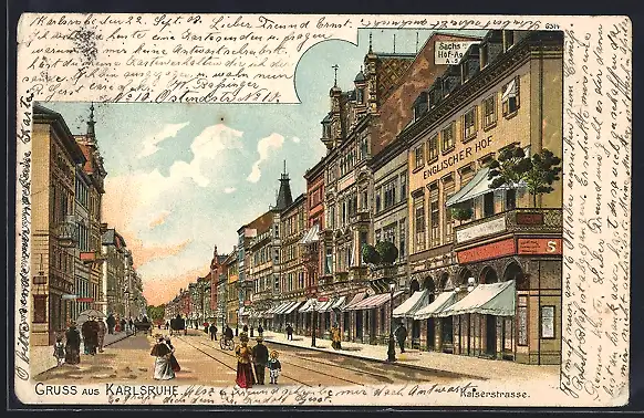 Lithographie Karlsruhe, Kaiserstrasse mit Hotel Englischer Hof