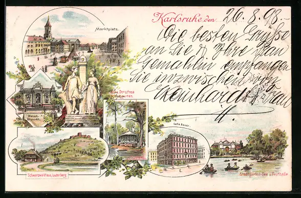 Lithographie Karlsruhe, Marktplatz, Café Bauer, Stadtgarten-See
