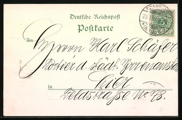 Personenbezogene Daten auf der Rückseite der Karte wurden durch blauen Textmarker unkenntlich gemacht. Die blauen Stellen sind auf die Vorderseite durchgeweicht und wirken sich negativ auf das Postkartenfoto aus
