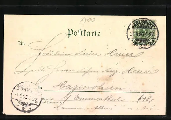 Personenbezogene Daten auf der Rückseite der Karte wurden durch blauen Textmarker unkenntlich gemacht. Die blauen Stellen sind auf die Vorderseite durchgeweicht und wirken sich negativ auf das Postkartenfoto aus