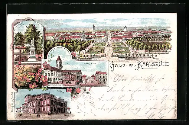 Lithographie Karlsruhe, Ortsansicht, Kriederdenkmal, Marktplatz, Hoftheater