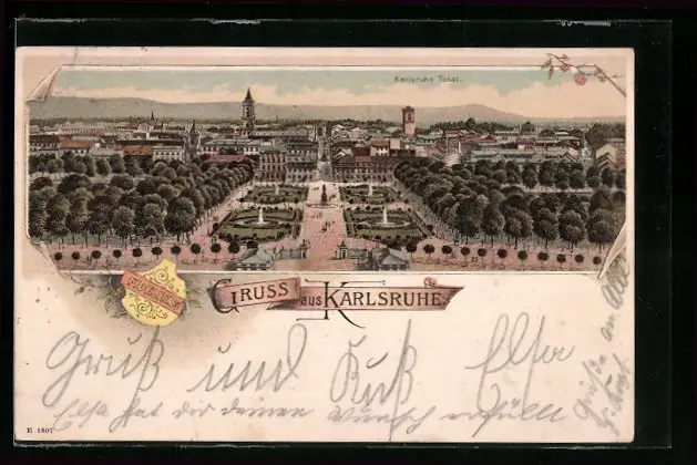 Lithographie Karlsruhe, Ortsansicht aus der Vogelschau
