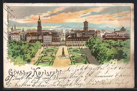 Lithographie Karlsruhe, Ortsansicht mit Parkanlage