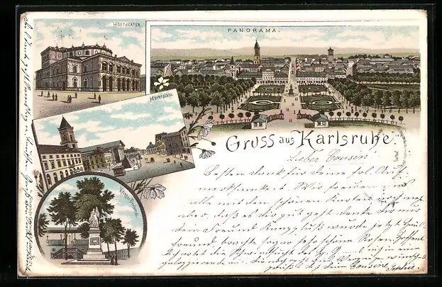 Lithographie Karlsruhe, Panorama, Hoftheater, Marktplatz