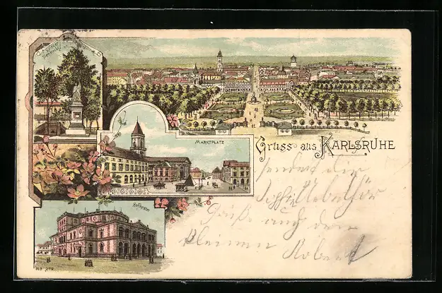 Lithographie Karlsruhe, Panorama, Marktplatz und Hoftheater