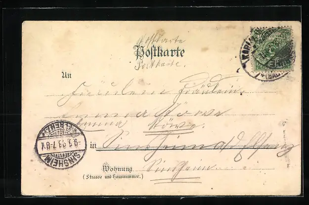 Personenbezogene Daten auf der Rückseite der Karte wurden durch blauen Textmarker unkenntlich gemacht. Die blauen Stellen sind auf die Vorderseite durchgeweicht und wirken sich negativ auf das Postkartenfoto aus