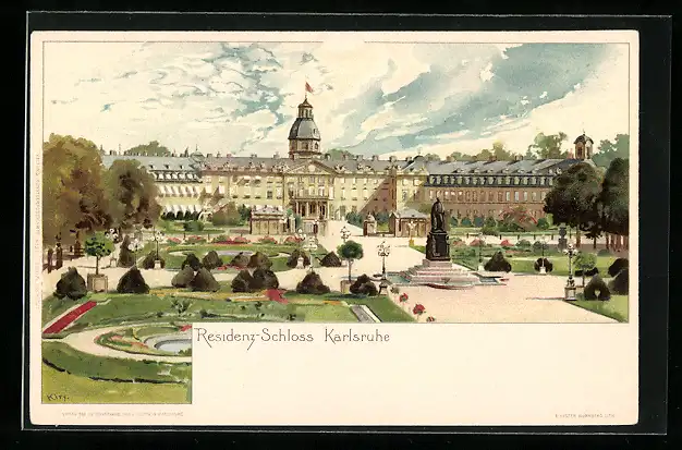 Lithographie Karlsruhe, Residenz-Schloss mit Vorhof