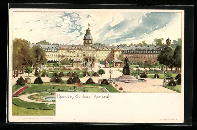 Lithographie Karlsruhe, Residenz-Schloss mit Vorhof