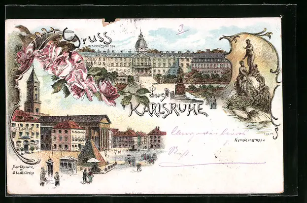 Lithographie Karlsruhe, Residenzschloss, Marktplatz und Stadtkirche