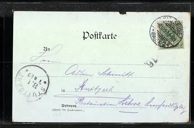 Personenbezogene Daten auf der Rückseite der Karte wurden durch blauen Textmarker unkenntlich gemacht. Die blauen Stellen sind auf die Vorderseite durchgeweicht und wirken sich negativ auf das Postkartenfoto aus