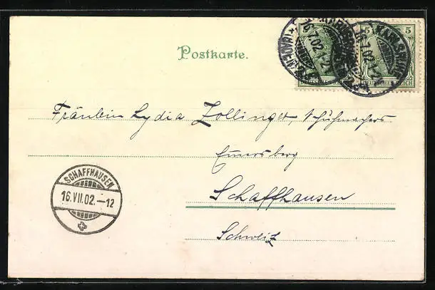 Personenbezogene Daten auf der Rückseite der Karte wurden durch blauen Textmarker unkenntlich gemacht. Die blauen Stellen sind auf die Vorderseite durchgeweicht und wirken sich negativ auf das Postkartenfoto aus
